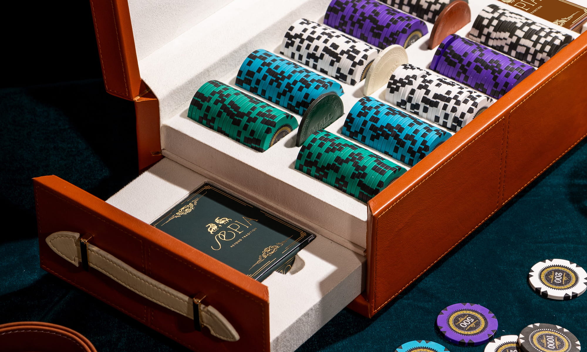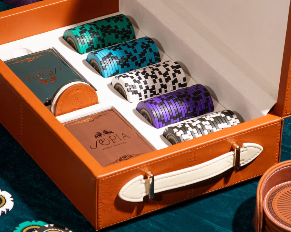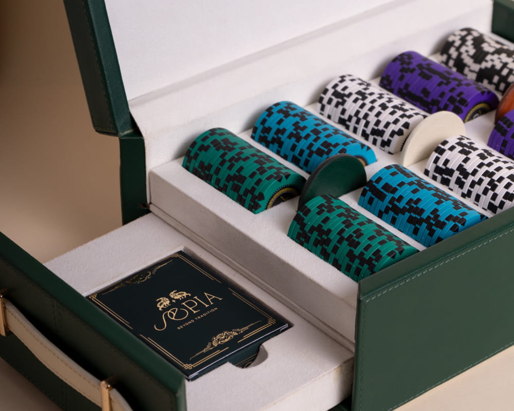 Bringing this flagship product to life required meticulous oversight throughout the entire manufacturing process. We selected premium leather in deep emerald and tan hues to create an elegant contrast with the custom-molded, dual-toned poker chips. The interior features a soft lining to protect the components, while the gold-stamped typography and bespoke playing cards add a layer of vintage luxury. This dual-purpose design successfully bridges the gap between interactive entertainment and refined interior styling, acting as both a functional game set and a striking sculptural accent for coffee tables.