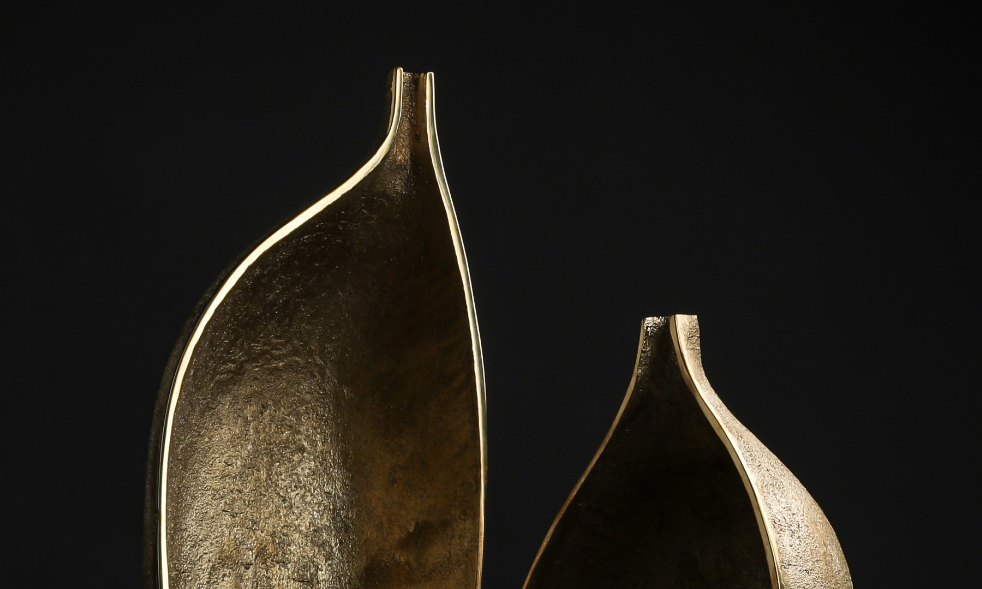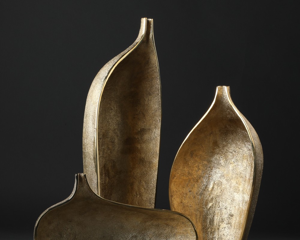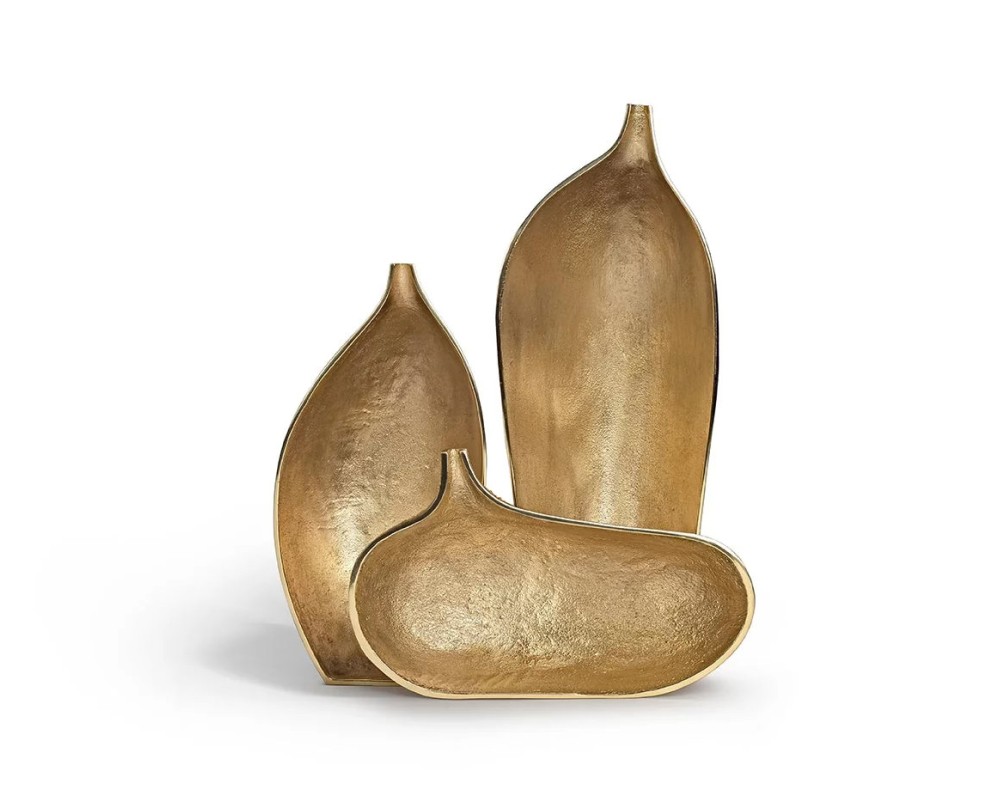 Crafted through a traditional sand-casting process, each Kinzo piece features a rich, textured brass finish that contrasts sharply with its precision-polished rims. The design’s signature half-cut profile reveals a grounded solidity, available in varying heights—from low and stout to tall and slender—to create a dynamic visual rhythm when styled as a set. This interplay of rough texture and gleaming edge allows the Kinzo to work beautifully as a singular statement or as part of a curated, multi-level narrative.